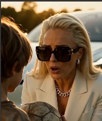 She slowly removes her sunglasses.